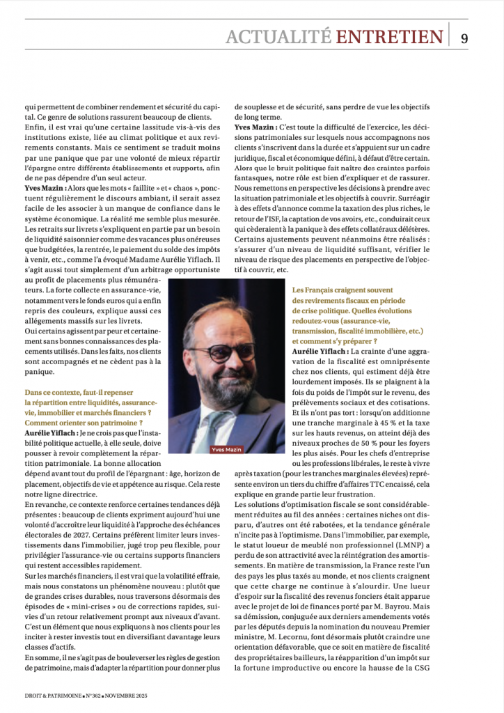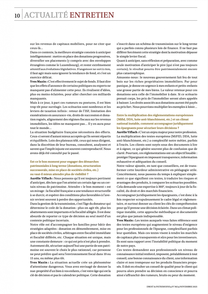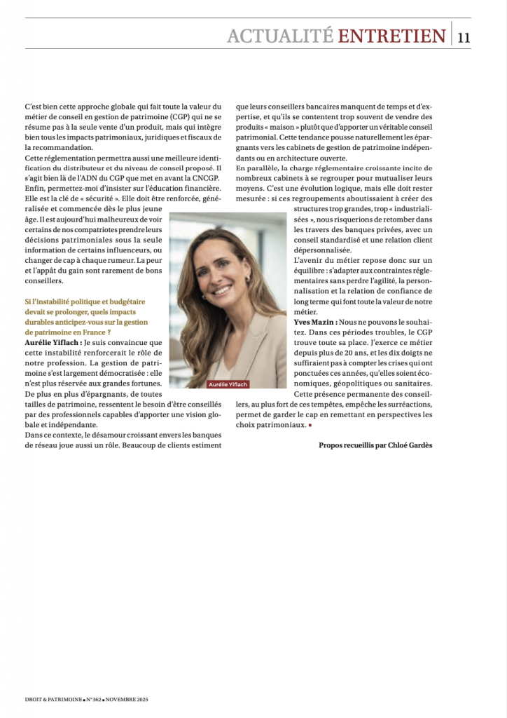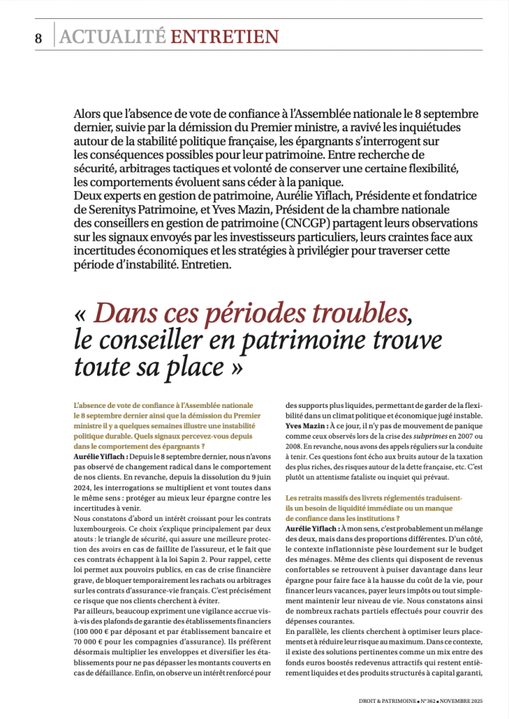 Dans un contexte de forte instabilité politique et économique, les épargnants s’interrogent sur l’avenir de leur patrimoine. Dans cet entretien exclusif, publié dans le numéro de novembre du prestigieux magazine Droit & Patrimoine, Aurelie Yiflach Tenenbaum, Présidente de Serenitys Patrimoine, nous éclaire sur les signaux qu’elle observe et les stratégies à adopter pour sécuriser son patrimoine.